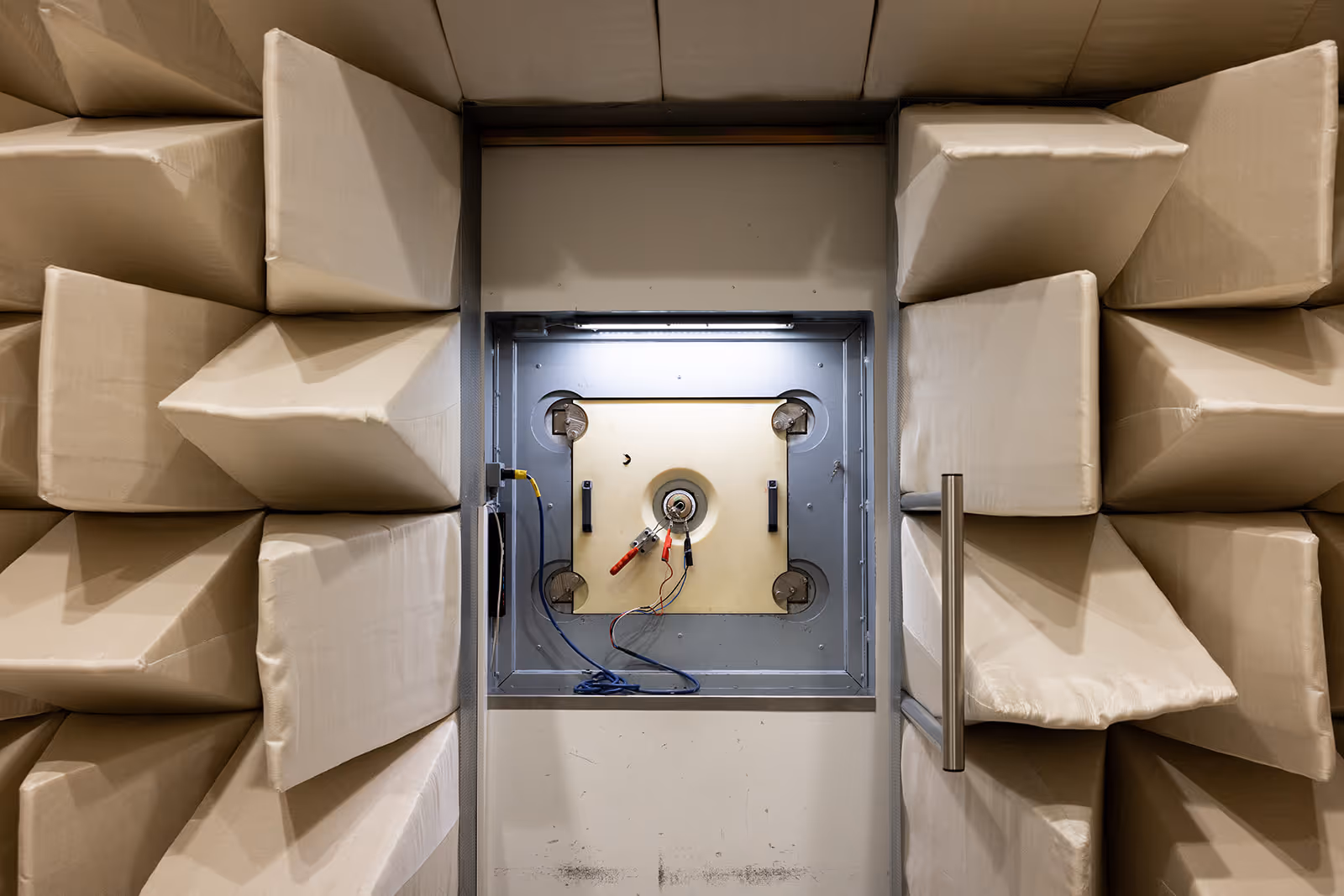 Our anechoic chamber provides the ultimate environment for precise acoustic measurements. With a background noise level below 0 dB and fully absorptive walls, this facility enables detailed analysis of speaker performance and sound characteristics.